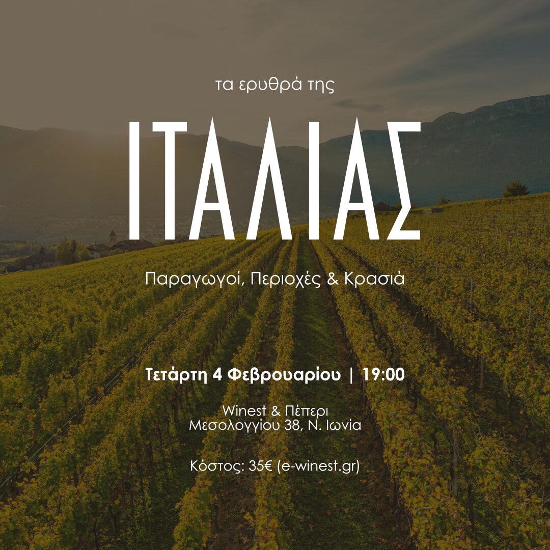 Σε αυτή τη θεματική γευσιγνωσία ακολουθούμε ένα νοητό ταξίδι από τον νότο της Puglia μέχρι τους λόφους του Piemonte και τη Valpolicella, εξερευνώντας πώς το κλίμα, το έδαφος και οι παραδόσεις διαμορφώνουν επτά εμβληματικά ερυθρά κρασιά.